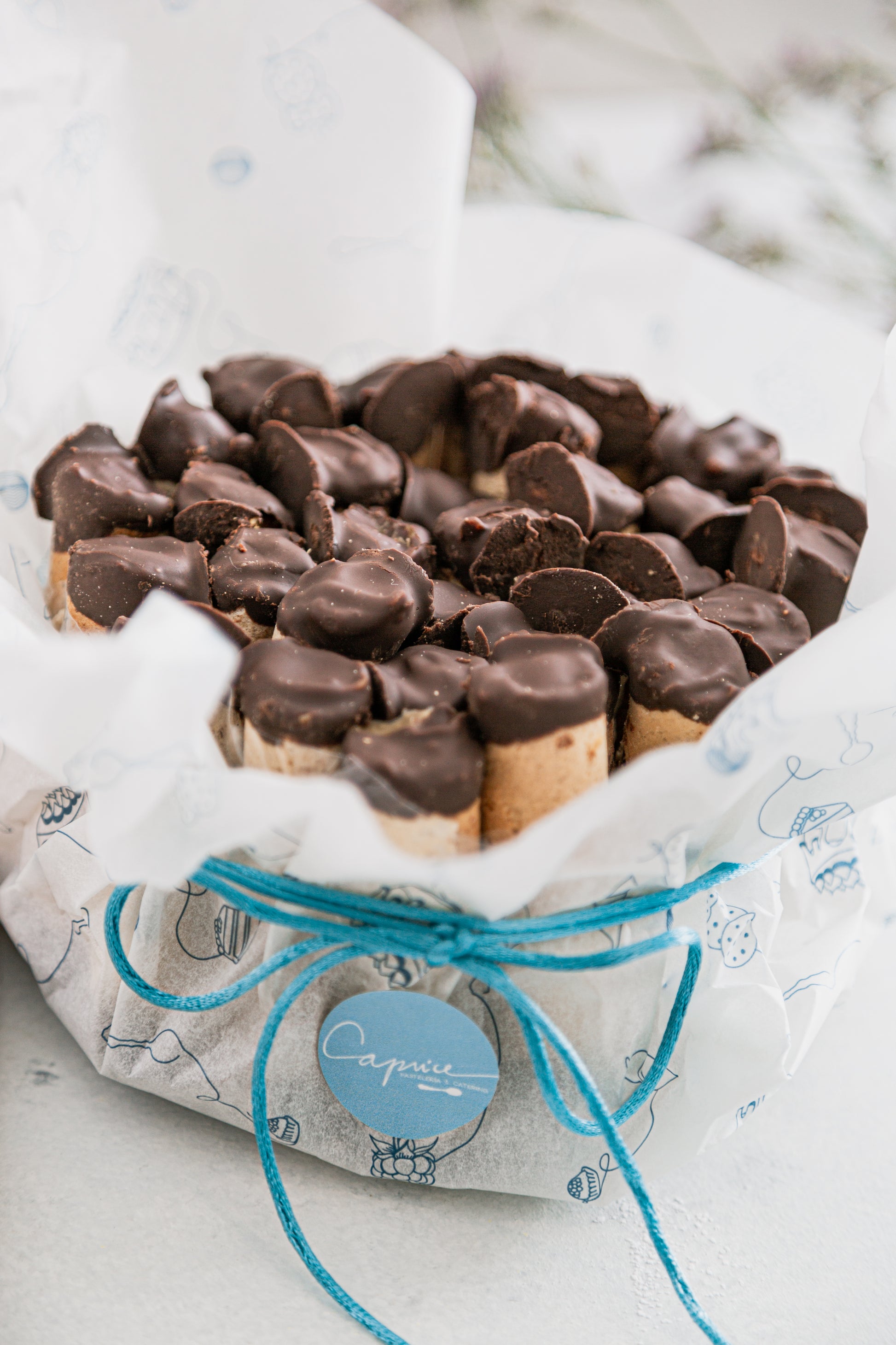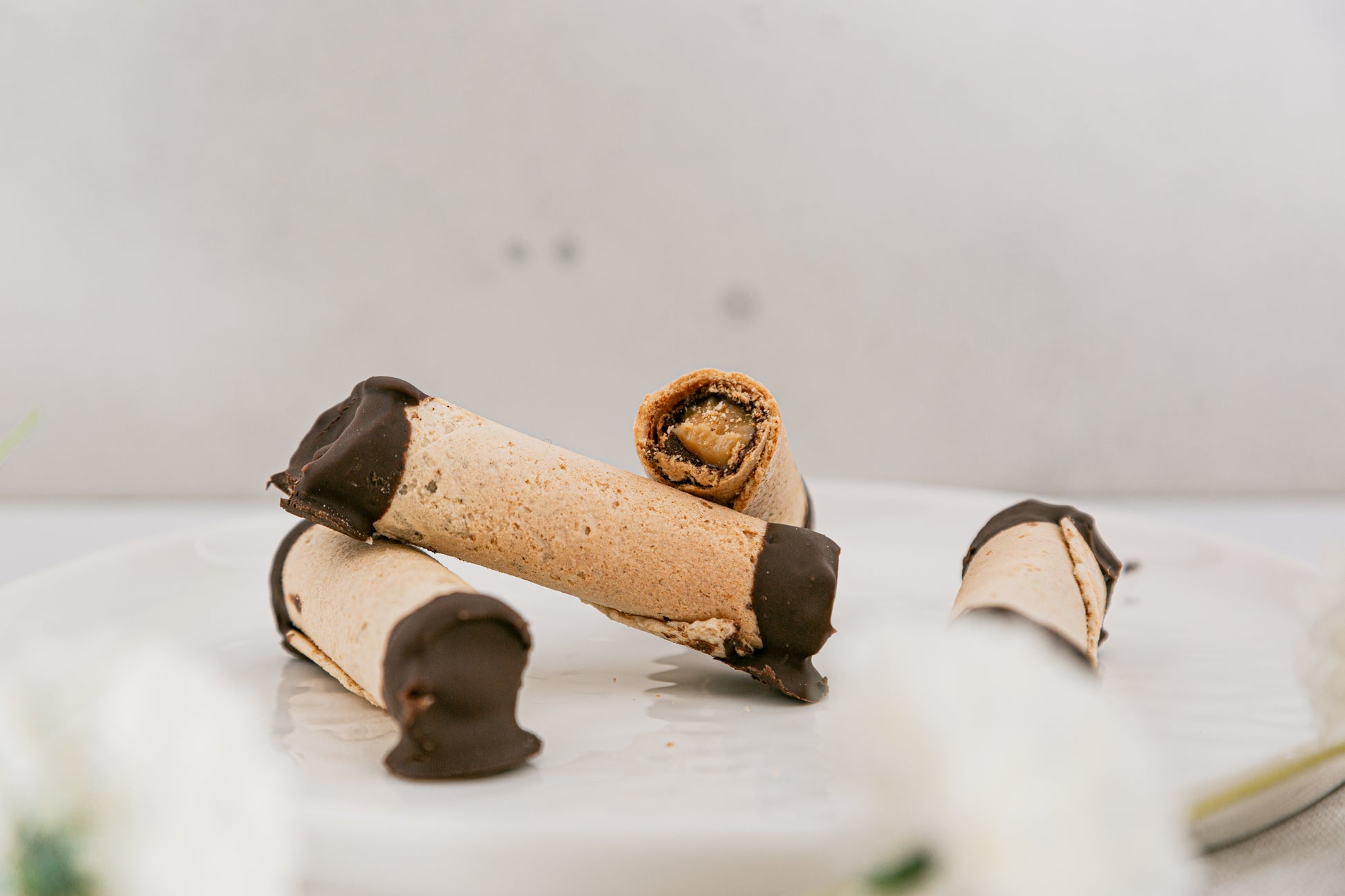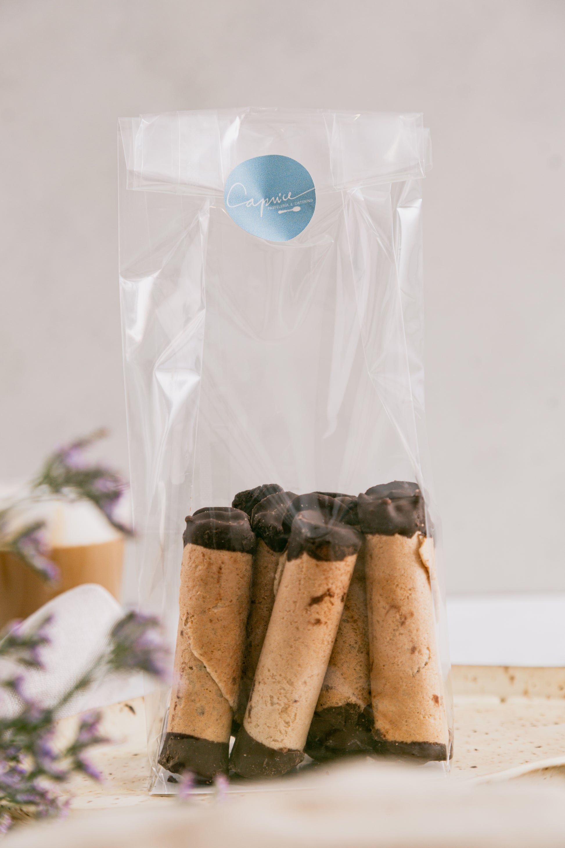 Crujiente masa bañadas puntas y su interior con chocolate y manjar blanco. Tamaño barquillo 7 cm
