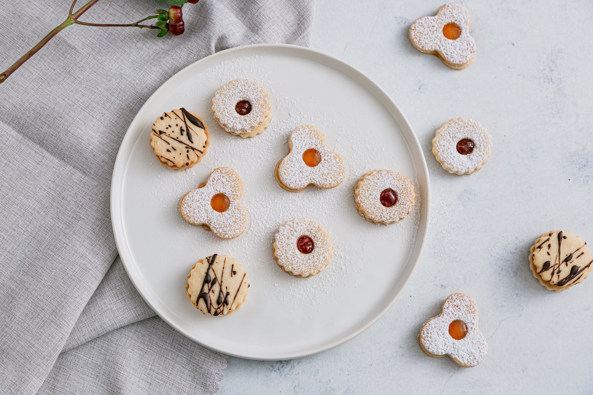 Delicadas y fina masa dulce con tres distintos rellenos, mermelada de frambuesa, manjar blanco y mermelada de damasco.