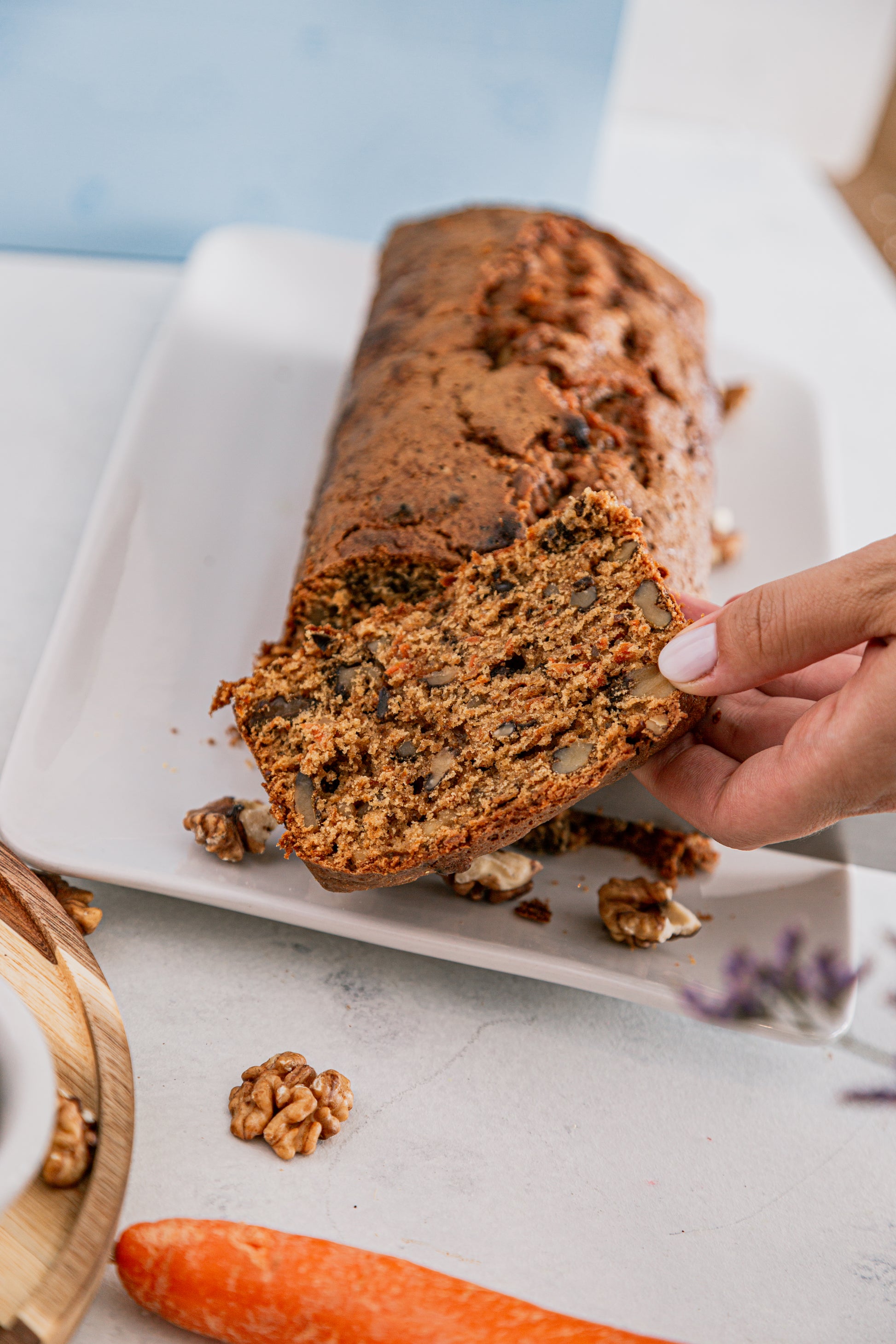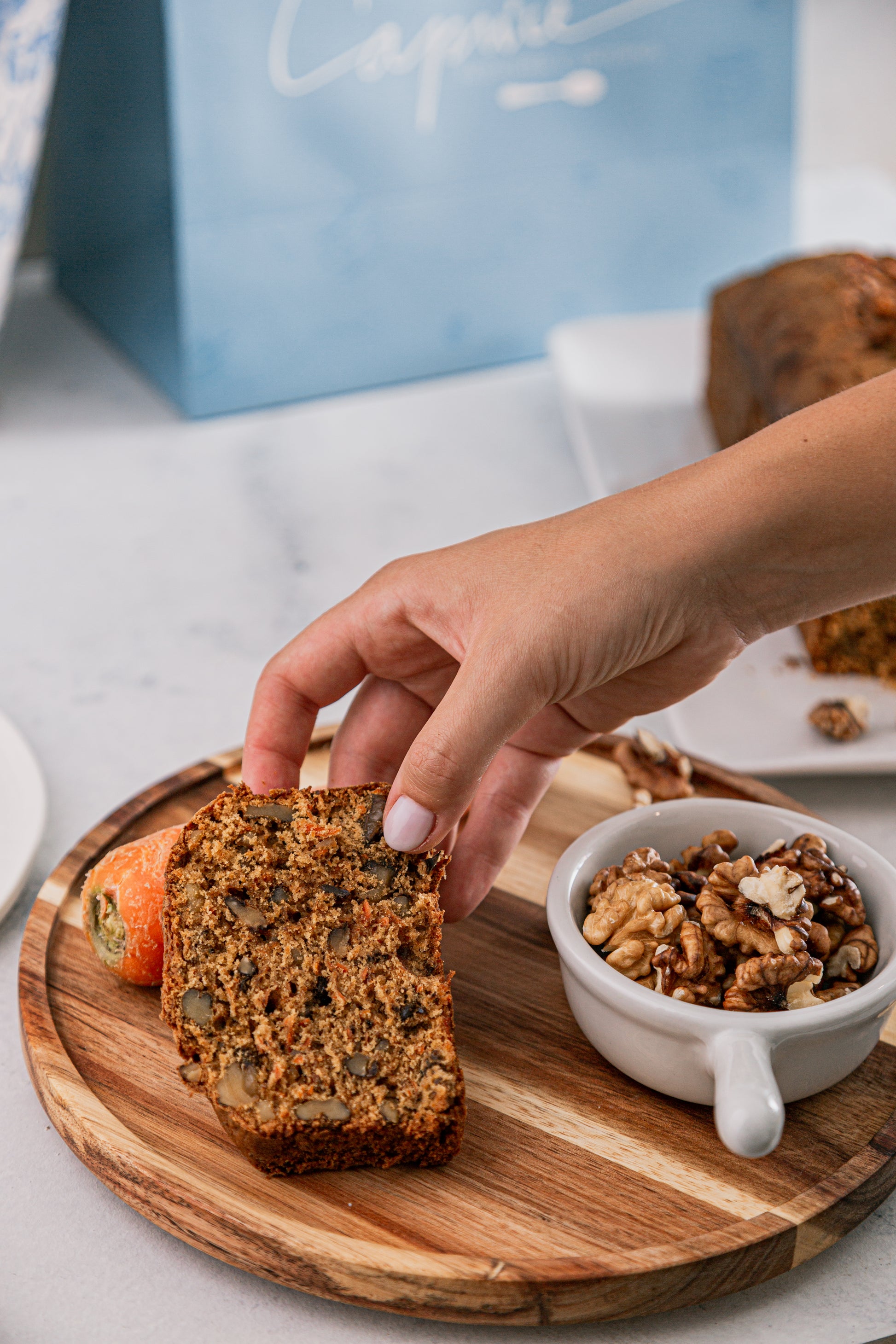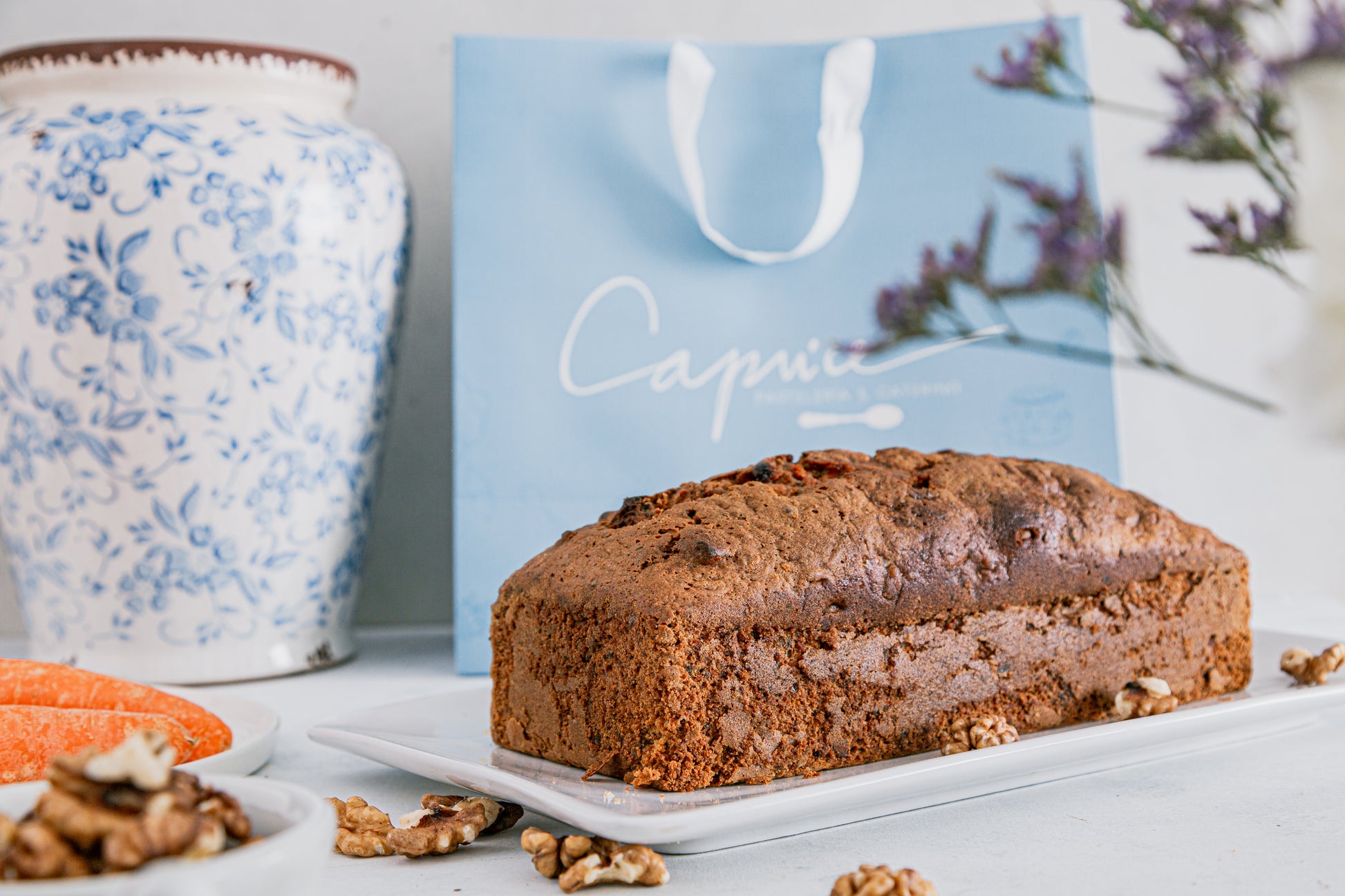 Sabor único, esponjoso y húmedo queque compuesto de zanahoria, nueces, y especias.